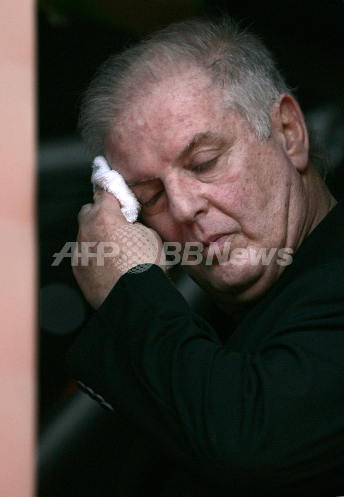 1942年、同地で生まれたバレンボイムは64歳。西東詩集管弦楽団は、バレンボイムとパレスチナ系アメリカ人の文学研究者、故エドワード・サイード氏(Edward Said)の提唱で1999年に誕生し、エジプト、シリア、レバノン、イスラエルなどから110名の才能ある若い音楽家が参加している。バレンボイムは又、2006年よりイタリア、スカラ座(Teatro alla Scala)の音楽監督を務めており、国連平和賞(United Nations Peace Medal)ドイツのエコー・クラシック(Echo Klassik)賞、ベルリン・ユダヤ博物館(Jewish Museum Berlin)のUnderstanding and Tolerance賞など、数多くの受賞も果たしている。(c)AFP/Juan MABROMATA