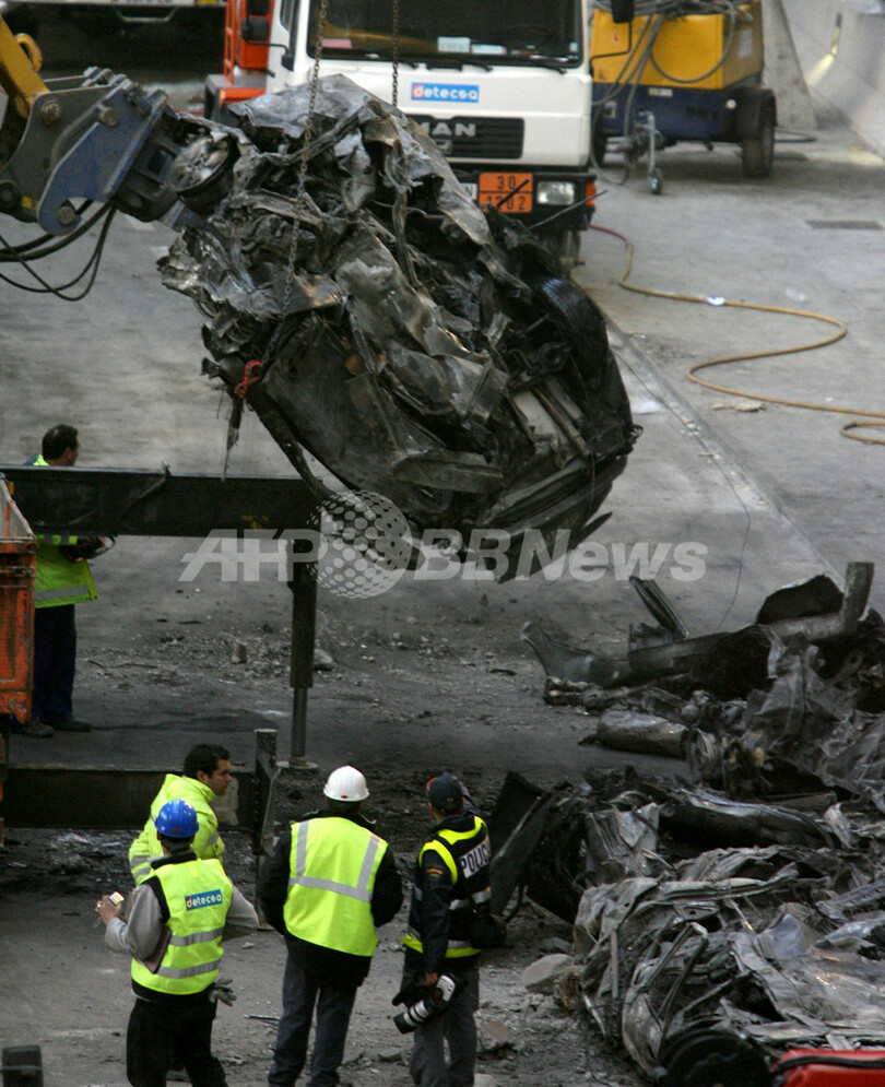 【マドリード/スペイン 2日 AFP】30日にマドリードのバラハス(Barajas)国際空港の駐車場で起きた爆弾テロ事件に巻き込まれ行方不明となっている南米出身の男性2人について、スペイン内務相は1日、生存はほぼ絶望的との見解を示した。事件の発生前、同組織のメンバーを名乗る人物がテロの予告電話を入れていたことから、このテロは非合法過激派組織「バスク祖国と自由(ETA)」による犯行とみられている。過去40年間にわたるテロで約850人の犠牲者を出したETA紛争をめぐっては、ETAが9か月前に停戦合意を発表していたが、今回の爆破事件によってこの合意は破られた形となり、紛争終結への期待は一気に低下した。写真は1日、マドリードのバラハス国際空港で車両の残骸を除去する作業員。(c)AFP/JAVIER SORIANO