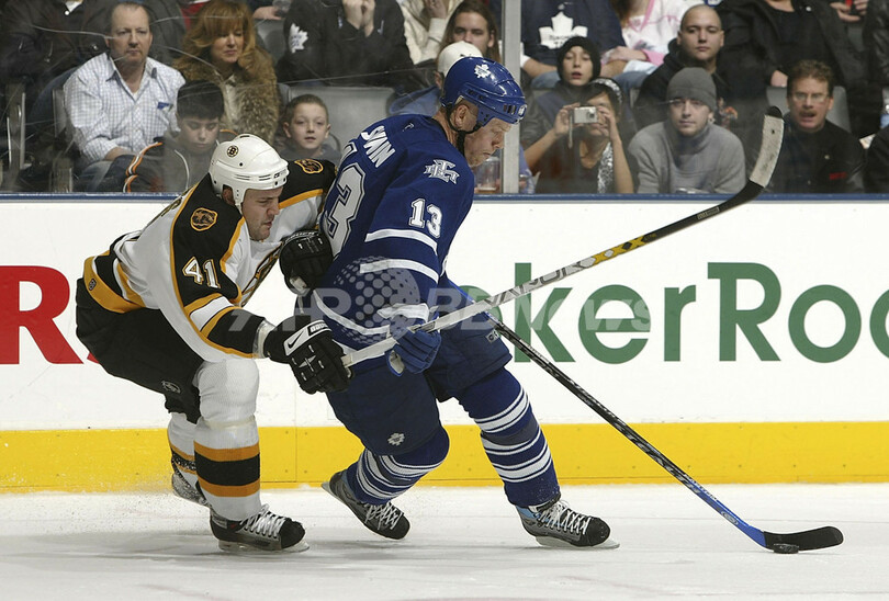 【トロント/カナダ 1日 AFP】06-07NHL、トロント・メープルリーフス(Toronto Maple Leafs)vsボストン・ブルーインズ(Boston Bruins)。メープルリーフスのマッツ・サンディーン(Mats Sundin、右)は、ブルーインズのアンドリュー・アルバーツ(Andrew Alberts)を背中で制しながらパックをキープする。サンディーンはこの試合、2ゴール1アシストでファーストスターに選出された。試合はメープルリーフスが5-1でブルーインズを降し、今季18勝目を飾った。(c)AFP/Getty Images Dave Sandford