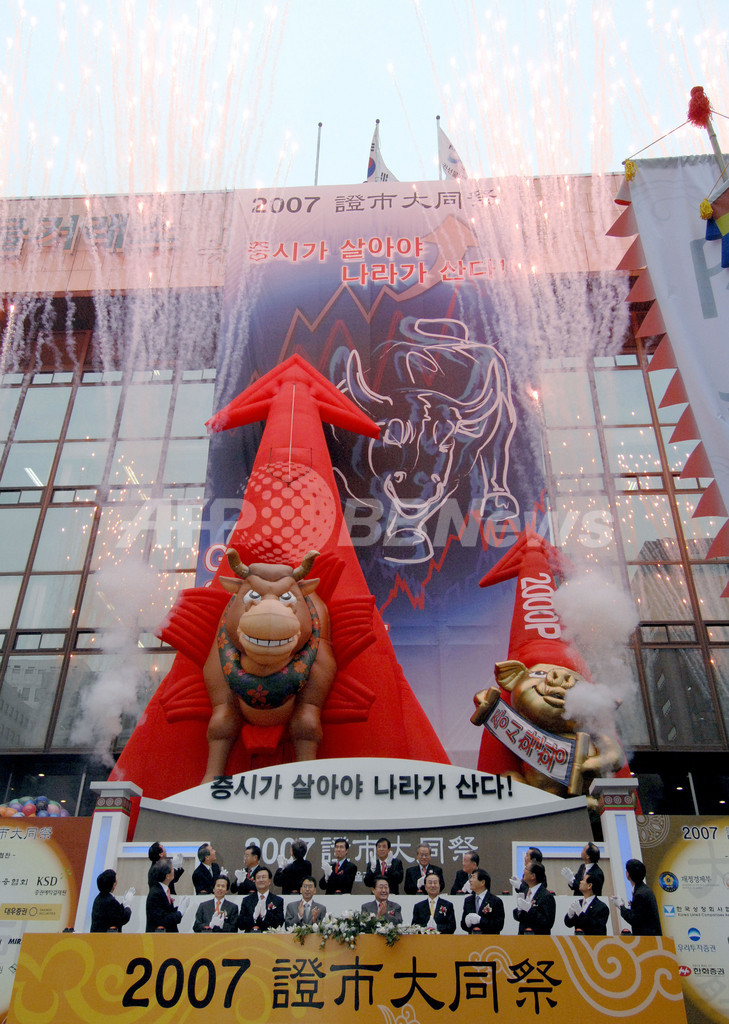 写真は2日、華やかに初取引を開始したソウルの韓国証券取引所。韓国総合株価指数(KOSPI)は 1,438.89ポイントから開始した。(c)AFP/JUNG YEON-JE