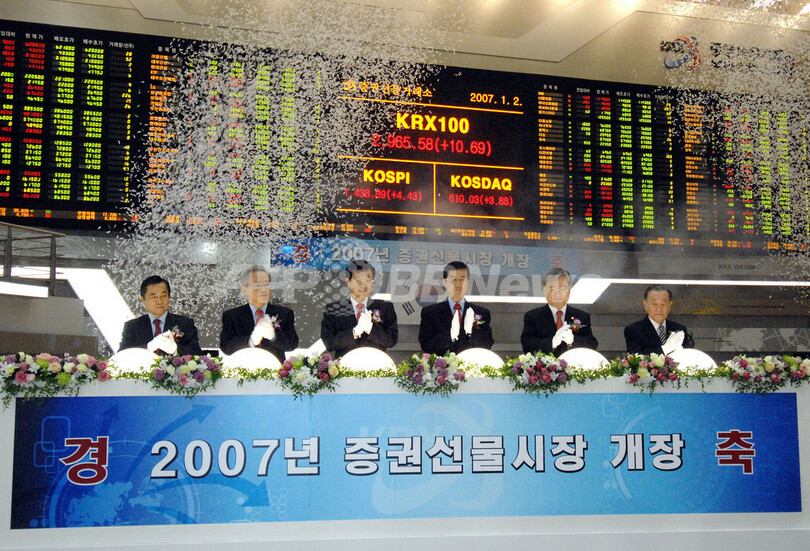 写真は2日、華やかに初取引を開始したソウルの韓国証券取引所。韓国総合株価指数(KOSPI)は 1,438.89ポイントから開始した。(c)AFP/JUNG YEON-JE