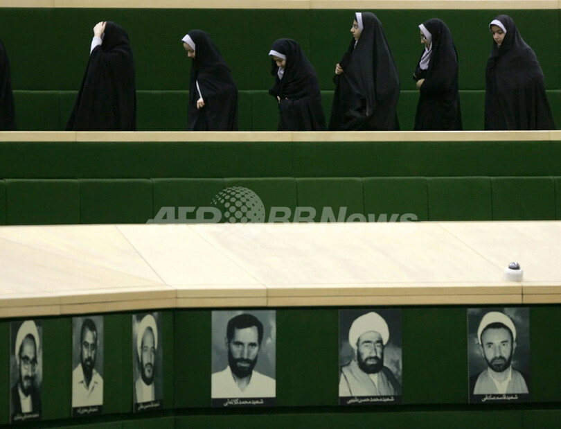 【テヘラン/イラン 3日 AFP】首都テヘラン(Tehran)で2日、国会議員および大統領選挙の選挙権を持つ年齢を現在の15歳から18歳に引き上げる法案が政府の反対を押しのけて可決された。法案が法として成立するためには、さらにすべての立法について調査する護憲評議会(Guardians Council)の厳しい審査を通らなければならない。写真は議場を後にする女学生たち。(c)AFP/BEHROUZ MEHRI