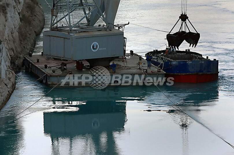 【アテネ/ギリシャ 2日 AFP】アテネの西およそ80キロメートルに位置するコリントス(Corinth)運河が、約1週間閉鎖されることになった。エーゲ(Aegean)海とイオニア(Ionian)海を結ぶ、全長6キロメートルにおよぶ水路であるこの運河では2006年12月31日に地滑りが発生しており、運河の管理会社であるPeriandros SAによれば、地滑りにより安全に航行するための水深が保てなくなっているという。写真は1日、岩石の除去作業にあたるクレーン船。(c)AFP/Valerie Gache