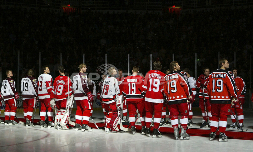 【デトロイト/米国 2日 AFP】06-07NHL、デトロイト・レッドウィングス(Detroit Red Wings)vsアナハイム・ダックス(Anaheim Ducks)。試合前に、1983年から昨シーズンまで22年間レッドウィングスに所属し、19年間キャプテンを務めたスティーブ・アイザーマン(Steve Yzerman)氏の背番号「19」の永久欠番セレモニーが行われた。試合は、2-1でレッドウィングスが勝利しセレモニーに華を添えた。(c)AFP/Getty Images Dave Sandford