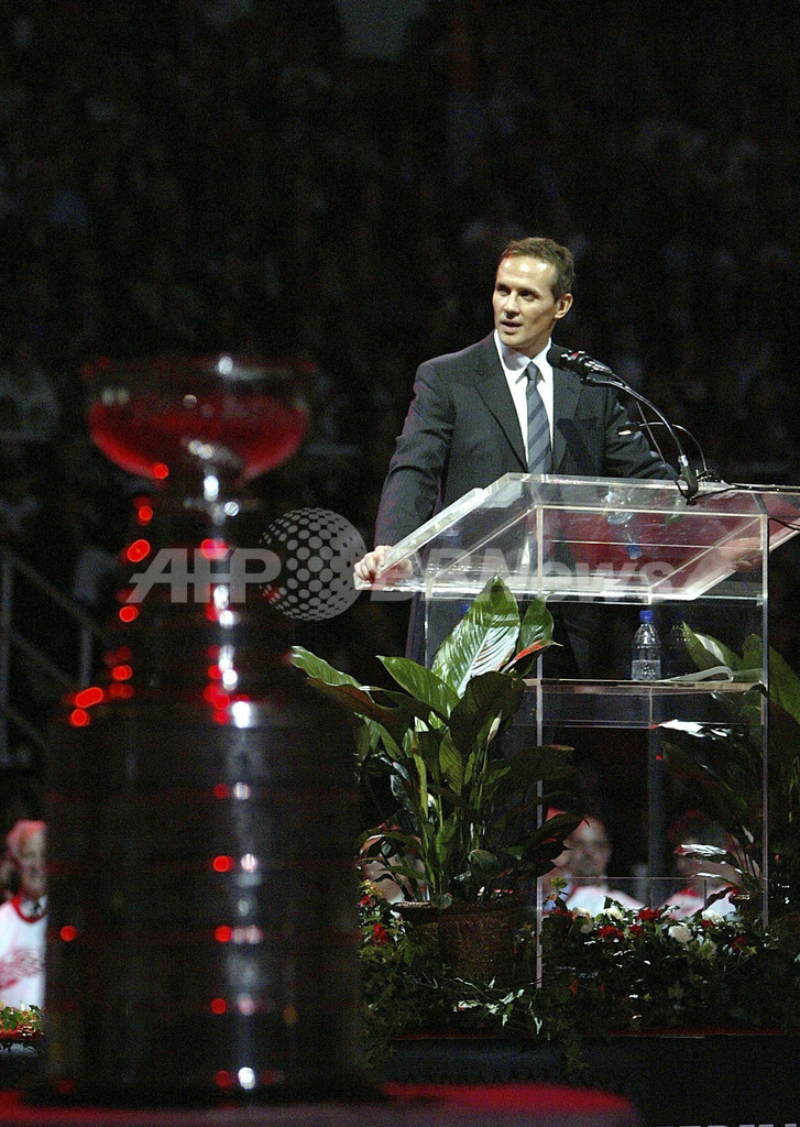 【デトロイト/米国 2日 AFP】06-07NHL、デトロイト・レッドウィングス(Detroit Red Wings)vsアナハイム・ダックス(Anaheim Ducks)。試合前に、1983年から昨シーズンまで22年間レッドウィングスに所属し、19年間キャプテンを務めたスティーブ・アイザーマン(Steve Yzerman)氏の背番号「19」の永久欠番セレモニーが行われた。試合は、2-1でレッドウィングスが勝利しセレモニーに華を添えた。(c)AFP/Getty Images Dave Sandford