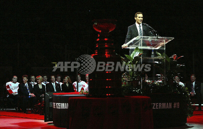 【デトロイト/米国 2日 AFP】06-07NHL、デトロイト・レッドウィングス(Detroit Red Wings)vsアナハイム・ダックス(Anaheim Ducks)。試合前に、1983年から昨シーズンまで22年間レッドウィングスに所属し、19年間キャプテンを務めたスティーブ・アイザーマン(Steve Yzerman)氏の背番号「19」の永久欠番セレモニーが行われた。試合は、2-1でレッドウィングスが勝利しセレモニーに華を添えた。(c)AFP/Getty Images Dave Sandford