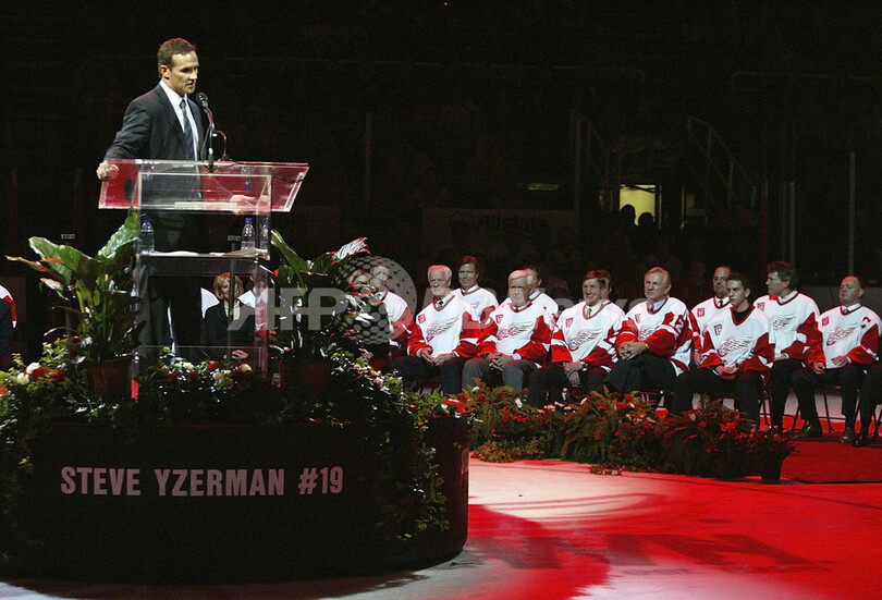 【デトロイト/米国 2日 AFP】06-07NHL、デトロイト・レッドウィングス(Detroit Red Wings)vsアナハイム・ダックス(Anaheim Ducks)。試合前に、1983年から昨シーズンまで22年間レッドウィングスに所属し、19年間キャプテンを務めたスティーブ・アイザーマン(Steve Yzerman)氏の背番号「19」の永久欠番セレモニーが行われた。試合は、2-1でレッドウィングスが勝利しセレモニーに華を添えた。(c)AFP/Getty Images Dave Sandford