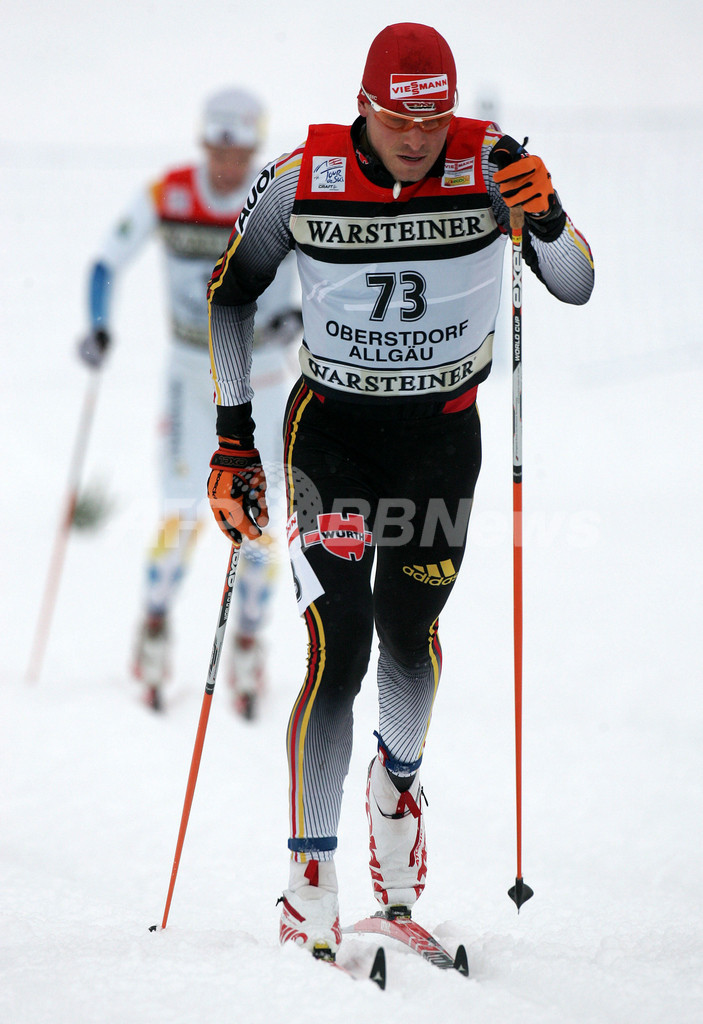 【オーベルストドルフ/ドイツ 3日 AFP】クロスカントリーW杯(FIS WORLD CUP CROSS-COUNTRY 2006/07)、ツール・ド・スキー(TOUR DE SKI)・第3ステージ、男子15キロメートル・クラシカル。ドイツのフランツ・ゲーリング(Franz Goering)は、39分40秒7でステージ優勝を飾り総合3位に順位を上げた。また2位にもドイツレネ・ゾマーフェルト(Rene Sommerfeldt、左)が、3位にもドイツのトビアス・アンゲラー(Tobias Angerer、右)が入り表彰台をドイツ勢が独占した。(c)AFP/DDP ROBERT MICHAEL