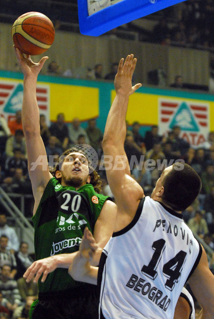 【ベオグラード/セルビア 3日 AFP】バスケットボール、ユーロリーグ・グループB、パルチザン・ベオグラード(Partizan Belgrade)vsDKVホベントゥット(DKV Joventut)。試合はパルチザン・ベオグラードが74-83でDKVホベントゥットに敗れ、グループリーグ6敗目を喫した。写真はDKVホベントゥットのアンドリュー・ベッツ(Andrew Betts)からマークを受けるパルチザン・ベオグラードのNikola Pekovic(左)。(c)AFP/ANDREJ ISAKOVIC