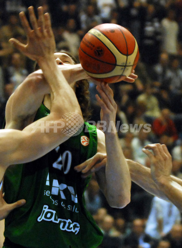 【ベオグラード/セルビア 3日 AFP】バスケットボール、ユーロリーグ・グループB、パルチザン・ベオグラード(Partizan Belgrade)vsDKVホベントゥット(DKV Joventut)。試合はパルチザン・ベオグラードが74-83でDKVホベントゥットに敗れ、グループリーグ6敗目を喫した。写真はDKVホベントゥットのアンドリュー・ベッツ(Andrew Betts)からマークを受けるパルチザン・ベオグラードのNikola Pekovic(左)。(c)AFP/ANDREJ ISAKOVIC
