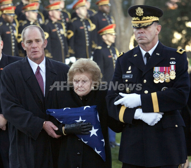 【グランドラピッズ/米国 4日 AFP】先月93歳で死去したジェラルド・フォード(Gerald R. Ford)元米大統領の棺が3日、国葬が営まれたワシントンD.C.(Washington D.C.)から故郷ミシガン(Michigan)州グランドラピッズ(Grand Rapids)に戻り、フォード大統領記念館(the Gerald R. Ford Presidential Museum)の敷地内に埋葬された。写真は3日、埋葬式で息子のスティーブン・フォード(Steven Ford)氏(左)とガイ・スワン(Guy Swan III)陸将補(右)に付き添われ埋葬式に参列するベティ・フォード(Betty Ford)元大統領夫人。(c)AFP/Gerald R. Ford Library & Museum/David Hume Kennerly