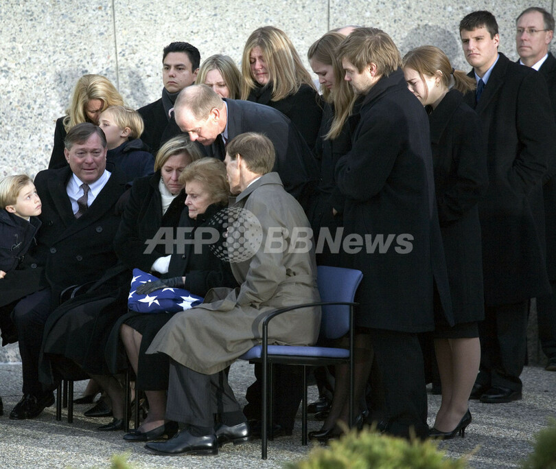 【グランドラピッズ/米国 4日 AFP】先月93歳で死去したジェラルド・フォード(Gerald R. Ford)元米大統領の棺が3日、国葬が営まれたワシントンD.C.(Washington D.C.)から故郷ミシガン(Michigan)州グランドラピッズ(Grand Rapids)に戻り、フォード大統領記念館(the Gerald R. Ford Presidential Museum)の敷地内に埋葬された。写真は3日、埋葬式で息子のスティーブン・フォード(Steven Ford)氏(左)とガイ・スワン(Guy Swan III)陸将補(右)に付き添われ埋葬式に参列するベティ・フォード(Betty Ford)元大統領夫人。(c)AFP/Gerald R. Ford Library & Museum/David Hume Kennerly