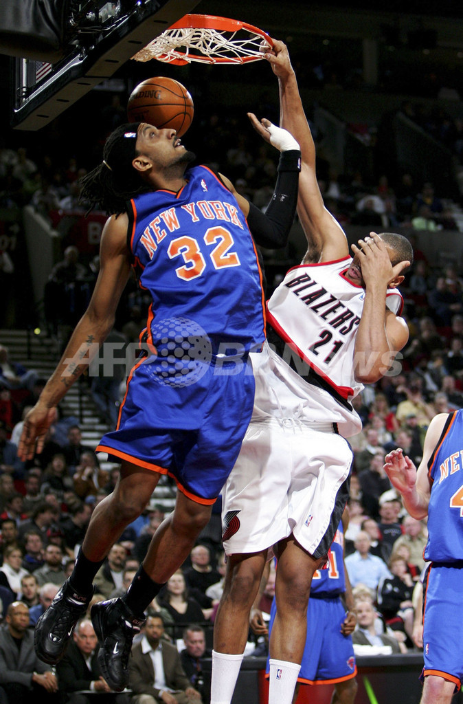 【ポートランド/米国 3日 AFP】06-07NBA、ポートランド・トレイルブレイザーズ(Portland Trail Blazers)vsニューヨーク・ニックス(New York Knicks)。試合は最大21点のリードを奪ったニックスが99-81で勝利を収め、ロードでの連敗を6で止めた。写真は、ドリブルでインサイドへ切れ込むニックスのステファン・マーブリー(Stephon Marbury)。(c)AFP/Getty Images Jonathan Ferrey