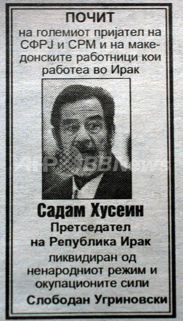【マケドニア 5日 AFP】Association of the Adherentsの悪名高い指導者、Slobodan Ugrinovski氏は、4日発行の日刊紙ドネブニク(Dnevnik)の有料告知欄で、イラクのサダム・フセイン(Saddam Hussein)元大統領の死亡記事を載せた。記事には、「サダム・フセイン元イラク大統領に敬意を表する」と書かれている。写真は4日、ドネブニクに載せられた死亡記事。(c)AFP/ROBERT ATANASOVSKI