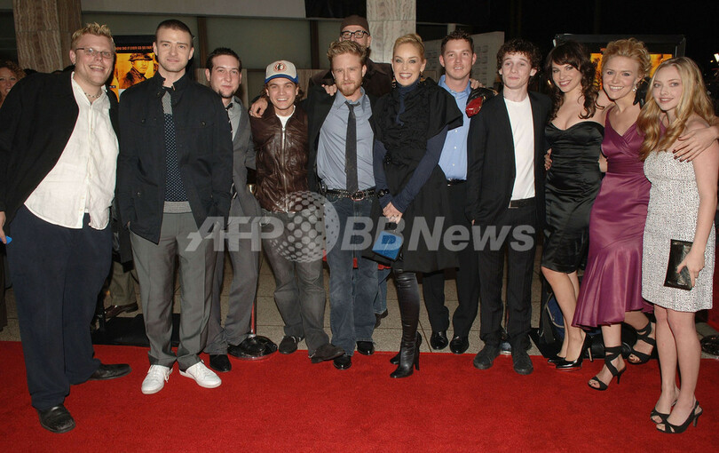 【ハリウッド/米国 5日 AFP】ユニバーサル・ピクチャーズ(Universal Pictures)配給、ニック・カサヴェテス(Nick Cassavetes)監督の新作映画「Alpha Dog」のプレミア上映会が3日、ハリウッドのシネラマ・ドーム(Cinerama Dome)で開催され、出演者らが出席した。同作品は、FBI史上、最年少で最重要指名手配リストに載った人物ジェシー・ジェイムズ・ハリウッド(Jesse James Hollywood)の実話に基づいた犯罪ドラマ。麻薬ディーラーとして10代の頃から大金を手にしていたハリウッドが15歳の少年を誘拐し、殺害するに至るまでの3日間に焦点を絞り、描いている。ハリウッドは2005年3月に逮捕されたが、裁判は現在も継続中。同作の公開が裁判の判決に影響を与えるのではないかと、ハリウッドの弁護士から公開差止請求が出ていたが、裁判所は公開を認める判決を下している。米国公開は1月12日から。写真はプレミア会場に姿を見せた(左2番目から)出演俳優のジャスティン・ティンバーレイク(Justin Timberlake)、クリス・マークエット(Chris Marquette)、エミール・ハーシュ(Emile Hirsch)、ベン・フォスター(Ben Foster)、ニック・カサヴェテス監督、シャロン・ストーン(Sharon Stone)、ショーン・ハトシー(Shawn Hatosy)、アントン・イェルチン(Anton Yelchin)、Charity Shea、ドミニク・スウェイン(Dominique Swain)、女優のアマンダ・セイフライド(Amanda Seyfried)。(c)AFP/Getty Images Stephen Shugerman