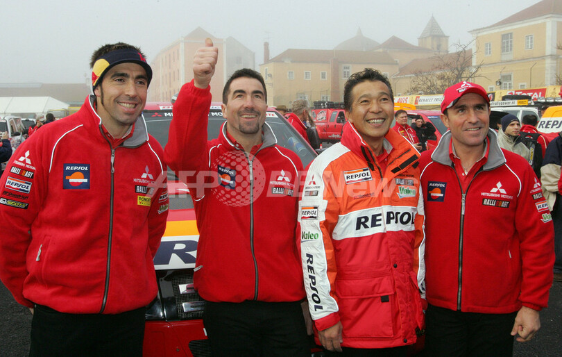 【リスボン/ポルトガル 4日 AFP】2007年1月6日から開幕するダカールラリー2007(Dakar rally 2007)の四輪部門に出場する三菱(Mitsubishi)のドライバー、(左から)ホアン・ナニ・ロマ(Joan Nani Roma、スペイン)、リュック・アルファン(Luc Alphand、フランス)、増岡浩(Hiroshi Masuoka、日本)、ステファン・ペテランセル(Stephane Peterhansel、フランス)は、スタート地点となるポルトガルの首都リスボンで車検・書類審査に臨んだ。29回目を迎える同ラリーは6日にリスボンをスタートしセネガルの首都ダカールまでの全15ステージで争われる。(c)AFP/DAMIEN MEYER