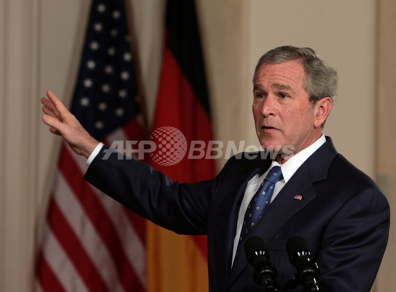 写真は、メルケル首相と合同記者会見を行うブッシュ大統領。(c)AFP/Jim WATSON