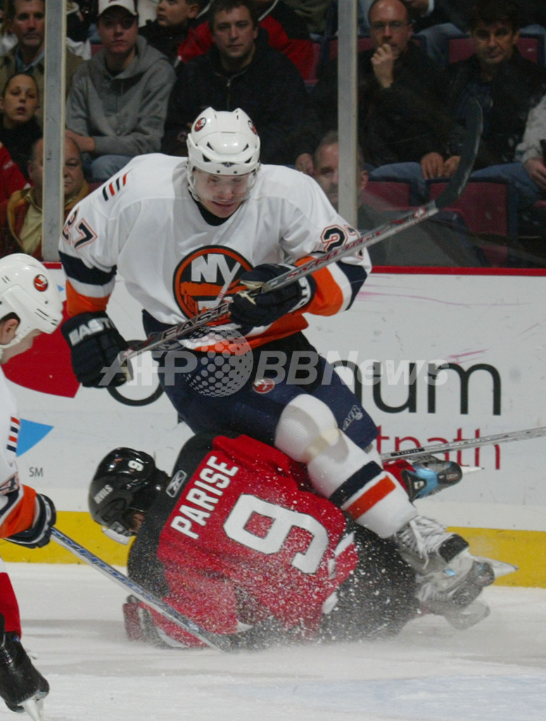 【イーストルーサーフォード/米国 4日 AFP】06-07NHL、ニュージャージー・デビルズ(New Jersey Devils)vsニューヨーク・アイランダーズ(New York Islanders)。デビルズのザック・パリーゼ(Zach Parise)は、2ゴールを挙げる活躍でこの試合のファーストスターズに選出された。試合はデビルズが4-3でアイランダーズに勝利し、今季23勝目を挙げた。写真は第1ピリオドに2得点目を決めて喜ぶパリーゼ。(c)AFP/Getty Images Jim McIsaac