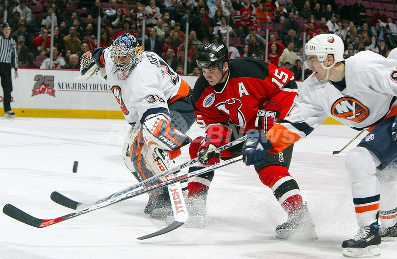 【イーストルーサーフォード/米国 4日 AFP】06-07NHL、ニュージャージー・デビルズ(New Jersey Devils)vsニューヨーク・アイランダーズ(New York Islanders)。デビルズのザック・パリーゼ(Zach Parise)は、2ゴールを挙げる活躍でこの試合のファーストスターズに選出された。試合はデビルズが4-3でアイランダーズに勝利し、今季23勝目を挙げた。写真は第1ピリオドに2得点目を決めて喜ぶパリーゼ。(c)AFP/Getty Images Jim McIsaac