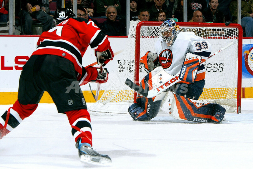 【イーストルーサーフォード/米国 4日 AFP】06-07NHL、ニュージャージー・デビルズ(New Jersey Devils)vsニューヨーク・アイランダーズ(New York Islanders)。デビルズのザック・パリーゼ(Zach Parise)は、2ゴールを挙げる活躍でこの試合のファーストスターズに選出された。試合はデビルズが4-3でアイランダーズに勝利し、今季23勝目を挙げた。写真は第1ピリオドに2得点目を決めて喜ぶパリーゼ。(c)AFP/Getty Images Jim McIsaac