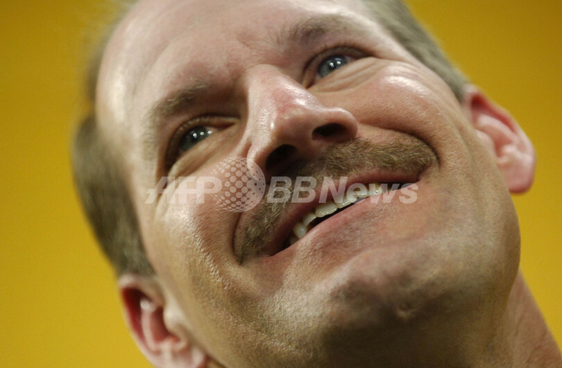 写真は、笑顔で会見に応じるカウアー氏。(c)AFP/Getty Images Jeff Swensen