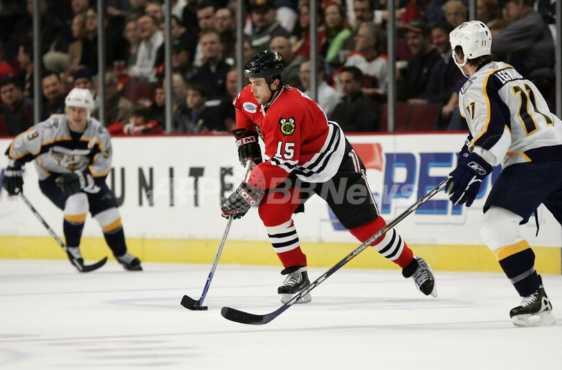 【シカゴ/米国 5日 AFP】06-07NHL、シカゴ・ブラックホークス(Chicago Blackhawks)vsナッシュビル・プレデターズ(Nashville Predators)。勝利を決めプレデターズのゴーリー、クリス・マソン(Chris Mason、右)はチームメイトのGreg Zanonと喜び合う。試合はプレデターズが8-3でブラックホークスに快勝し、今季27勝目を挙げた。(c)AFP/Getty Images Jonathan Daniel