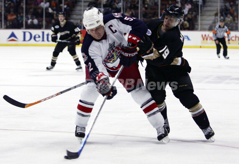 【アナハイム/米国 5日 AFP】06-07NHL、アナハイム・ダックス(Anaheim Ducks)vsコロンバス・ブルージャケッツ(Columbus Blue Jackets)。第3ピリオド18分40秒、ブルージャケッツのマニ・マルホトラ(Manny Malhotra)は、勝ち越しとなるチーム4点目のゴールを決めてチームメイトと共に歓喜する。試合は、ブルージャケッツが第3ピリオドに一挙4得点を挙げて4-3でダックスに逆転勝利、今季16勝目を収めた。(c)AFP/Getty Images Harry How