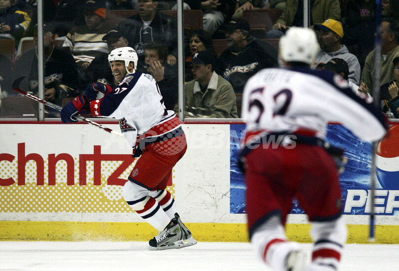 【アナハイム/米国 5日 AFP】06-07NHL、アナハイム・ダックス(Anaheim Ducks)vsコロンバス・ブルージャケッツ(Columbus Blue Jackets)。第3ピリオド18分40秒、ブルージャケッツのマニ・マルホトラ(Manny Malhotra)は、勝ち越しとなるチーム4点目のゴールを決めてチームメイトと共に歓喜する。試合は、ブルージャケッツが第3ピリオドに一挙4得点を挙げて4-3でダックスに逆転勝利、今季16勝目を収めた。(c)AFP/Getty Images Harry How