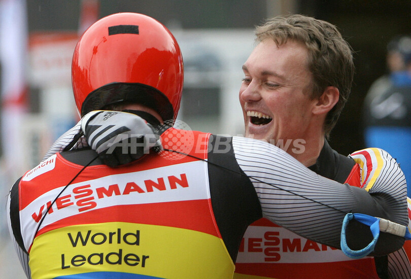 【ケーニヒス/ドイツ 6日 AFP】リュージュW杯(FIL Luge World Cup)・第5戦、男子・二人乗り。ドイツのパトリック・ライトナー(Patric Leitner)/アレクサンダー・レッシュ(Alexander Resch)組は、1本目47秒540、2本目47.617をマークし、合計1分35秒157で優勝を果たし、今季3連勝を挙げた。写真は勝利を喜ぶレッシュ(右)とライナート。(c)AFP/OLIVER LANG