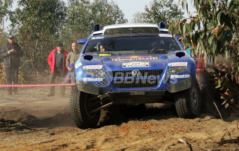 【ポルティマン/ポルトガル 6日 AFP】ダカールラリー2007(Dakar rally 2007)、四輪部門・第1ステージ(リスボンからポルティマン、競走区間117キロメートル/総距離464キロメートル)。フォルクスワーゲン(Volkswagen)のカルロス・ソーザ(Carlos Souza、ポルトガル)は、トップタイム1時間20分38秒をマークしてステージ優勝を飾った。(c)AFP/DAMIEN MEYER