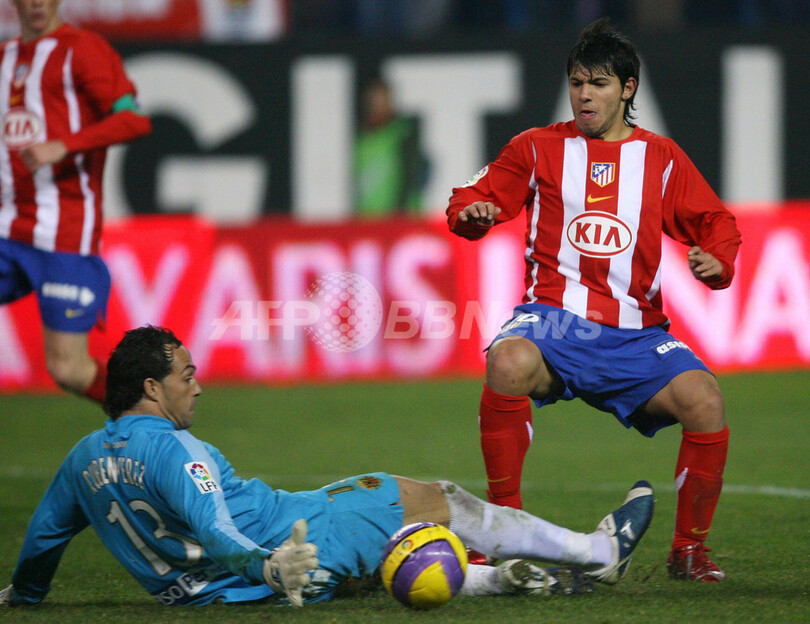 【マドリード/スペイン 6日 AFP】サッカー、スペイン・リーガエスパニョーラ1部第17節、アトレティコ・マドリード(Atletico de Madrid)vsヒムナスティク(Gimnastic)。試合は0-0に引き分けに終わった。写真は、ヒムナスティクのGKルベン・ペレス (Ruben Perez)の前に詰めるアトレティコ・マドリードのセルヒオ・アグエロ(Sergio Aguero、右)。(c)AFP/PIERRE-PHILIPPE MARCOU