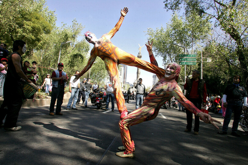 【メキシコシティ/メキシコ 7日 AFP】キリスト教の祝祭日「公現祭(Epiphany)」にあたる6日、世界各地で様々な祝いの行事が行なわれる中、メキシコシティでは、様々な衣装を身につけた人々がパレードを行なった。「公現祭」とはキリスト生誕を知った東方の三博士が、星に導かれてベツレヘムまでキリストの礼拝に訪れたとされる日を記念するもの。写真は、パレードに参加したジャグラーたち。(c)AFP/fredo ESTRELLA