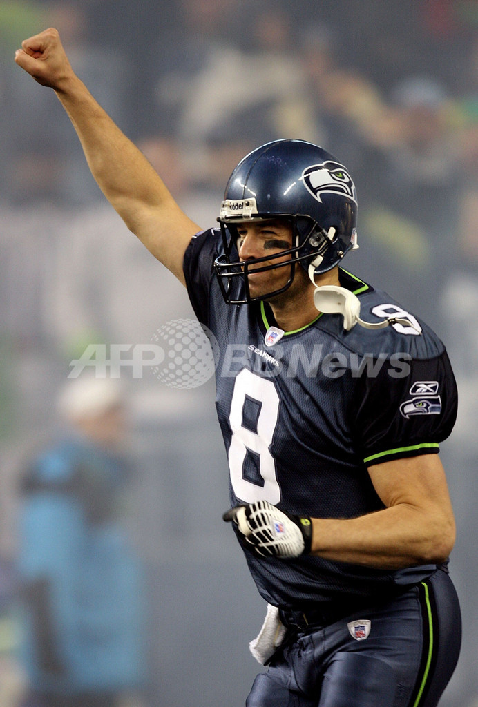 【シアトル/米国 6日 AFP】NFL・プレーオフNFC1回戦、シアトル・シーホークス(Seattle Seahawks)vsダラス・カウボーイズ(Dallas Cowboys)。シーホークスのQBマット・ハッセルベック(Matt Hasselbeck)は、第4Q残り4分24秒にチームを勝利へ導く37ヤードタッチダウンパスを通すなど、2タッチダウンを含むパス36本中18本を成功させて240ヤードを獲得し、チームの勝利に貢献した。試合はシーホークスが21-20でカウボーイズに辛勝し、NFC準決勝進出を決めた。写真は、勝利を喜ぶハッセルベック。(c)AFP/Getty Images Otto Greule Jr