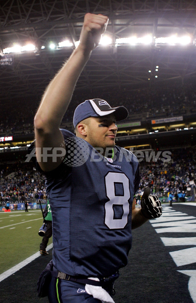 【シアトル/米国 6日 AFP】NFL・プレーオフNFC1回戦、シアトル・シーホークス(Seattle Seahawks)vsダラス・カウボーイズ(Dallas Cowboys)。シーホークスのQBマット・ハッセルベック(Matt Hasselbeck)は、第4Q残り4分24秒にチームを勝利へ導く37ヤードタッチダウンパスを通すなど、2タッチダウンを含むパス36本中18本を成功させて240ヤードを獲得し、チームの勝利に貢献した。試合はシーホークスが21-20でカウボーイズに辛勝し、NFC準決勝進出を決めた。写真は、勝利を喜ぶハッセルベック。(c)AFP/Getty Images Otto Greule Jr