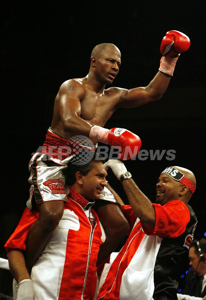 【フロリダ/米国 6日 AFP】ボクシング、WBA世界スーパーウェルター級タイトルマッチ12回戦。挑戦者のトラビス・シムス(Travis Simms)は、WBA世界スーパーウェルター級チャンピオンのホセ・アントニオ・リベラ(Jose Antonio Rivera)と対戦。試合は、挑戦者シムスが王者リベラに9回TKOで勝利を収め、新チャンピオンとなった。(c)AFP/Getty Images Marc Serota