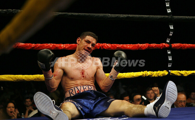 【フロリダ/米国 6日 AFP】ボクシング、WBA世界スーパーウェルター級タイトルマッチ12回戦。挑戦者のトラビス・シムス(Travis Simms)は、WBA世界スーパーウェルター級チャンピオンのホセ・アントニオ・リベラ(Jose Antonio Rivera)と対戦。試合は、挑戦者シムスが王者リベラに9回TKOで勝利を収め、新チャンピオンとなった。(c)AFP/Getty Images Marc Serota