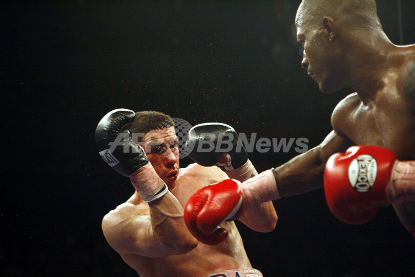 【フロリダ/米国 6日 AFP】ボクシング、WBA世界スーパーウェルター級タイトルマッチ12回戦。挑戦者のトラビス・シムス(Travis Simms)は、WBA世界スーパーウェルター級チャンピオンのホセ・アントニオ・リベラ(Jose Antonio Rivera)と対戦。試合は、挑戦者シムスが王者リベラに9回TKOで勝利を収め、新チャンピオンとなった。(c)AFP/Getty Images Marc Serota