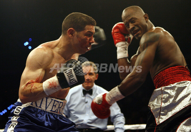 【フロリダ/米国 6日 AFP】ボクシング、WBA世界スーパーウェルター級タイトルマッチ12回戦。挑戦者のトラビス・シムス(Travis Simms)は、WBA世界スーパーウェルター級チャンピオンのホセ・アントニオ・リベラ(Jose Antonio Rivera)と対戦。試合は、挑戦者シムスが王者リベラに9回TKOで勝利を収め、新チャンピオンとなった。(c)AFP/Getty Images Marc Serota