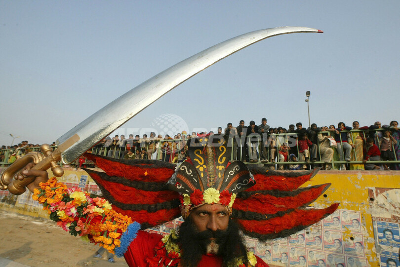 【アラハバード/インド 7日 AFP】ガンジス(Ganges)川、ヤムナ(Yamuna)川、Saraswati川が合流するアラハバード(Allahabad)で、ヒンドゥー教徒の祭典「Ardh Kumbh Mela(Half Pitcher Festival)」が開催されている。世界最大規模の宗教集会の1つである同祭典は、不老不死の酒の入った水差しをめぐる神と悪魔の神話上の戦いをたたえるもので、45日間にわたって行われる。祭典には、数百万人の信者や聖職者たちが参加する。写真は同日、剣を掲げ信者たちをガンジス川の岸に導く男性。(c)AFP