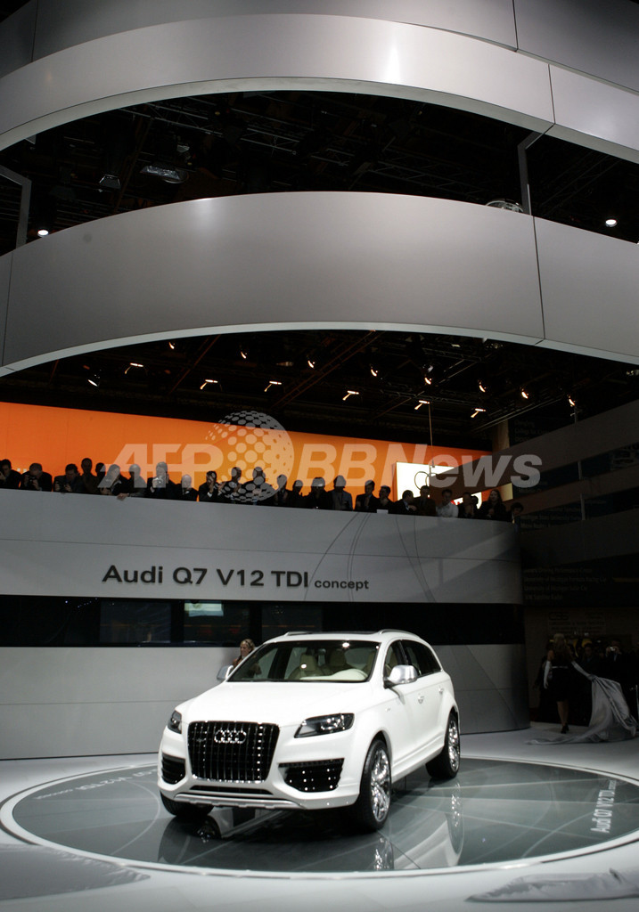 【デトロイト/米国 8日 AFP】北米国際自動車ショー(North American International Auto Show、NALAS)が7日、ミシガン(Michigan)州デトロイト(Detroit)のコボ・センター(Cobo Hall)で開幕した。開催から100年目を迎えた世界的に有名なこのショーでは、経営不振に陥っているゼネラル・モーターズ(General Motors、GM)が、トラック・オブ・ザ・イヤーとカー・オブ・ザ・イヤーをダブル受賞するという、珍しい快挙を成し遂げた。写真は同日、北米国際自動車ショーで披露された、V12 TDI搭載のコンセプトカー、アウディ(Audi)Q7。(c)AFP/Stan HONDA