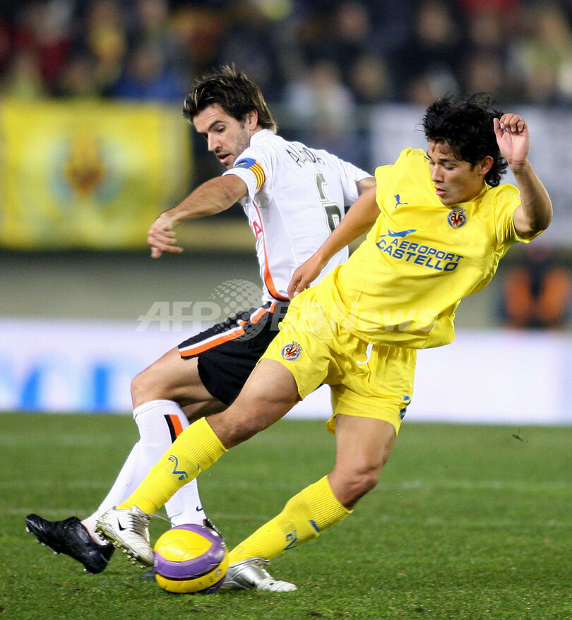 【ビジャレアル/スペイン 7日 AFP】サッカー、スペイン・リーガエスパニョーラ1部・第17節、ビジャレアル(Villarreal)vsバレンシア(Valencia)。試合は0-1でバレンシアがビジャレアルを降し、バレンシアは4連勝でシーズン9勝目を挙げた。写真は、ビジャレアルのフアン・マヌエル・ペニャ(Juan Manuel Pena、右)を背にボールをキープするバレンシアのダビド・ビジャ(David Villa)。(c)AFP/JOSE JORDAN