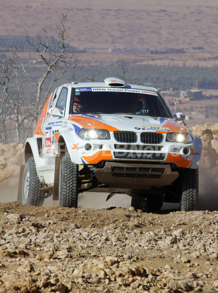【エルラシディア/モロッコ 8日 AFP】ダカールラリー2007(Dakar rally 2007)、四輪部門・第3ステージ(ナダールからエルラシディア、競走区間252キロメートル/総距離648キロメートル)。総合3位からスタートしたフォルクスワーゲン(Volkswagen)のジニール・ドゥビリエ(Giniel De Villiers、南アフリカ)は、2時間46分12秒でステージ優勝を飾り、合計タイム5時間10分21秒で総合2位に順位を上げた。(c)AFP/DAMIEN MEYER