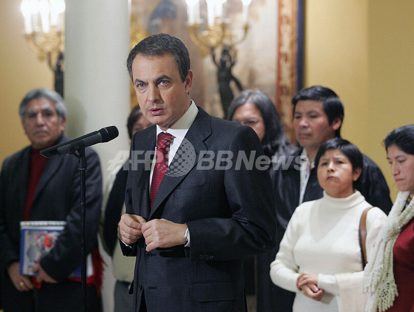 【マドリード/スペイン 10日 AFP】バスク祖国と自由(ETA)は9日、2006年12月31日に発生したマドリード(Madrid)空港爆破を正式に認める声明を出した。同日、マドリード、バラハス(Barajas)空港の駐車場で爆弾が爆発、エクアドル人男性ら2人が死亡している。ETAは停戦協定は現在も継続しており、平和を望んでいるとの声明も同時に発表している。写真は同日、マドリードの首相官邸(Moncloa palace)でエクアドル団体のレセプションに出席し、テロについて演説を行うホセ・ルイス・ロドリゲス・サパテロ(Jose Luis Rodriguez Zapatero)首相。(c)AFP