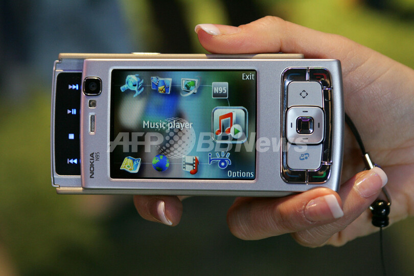 写真は9日、米国ネバダ州ラスベガスで開催中のコンシューマエレクトロニクス展示会(Consumer Electronics Show)に展示された新型Nokia「N95」 。カールツァイスのレンズを採用した500万画素カメラ、動画撮影機能、音楽再生機、インターネット接続のための無線LAN機能などが搭載されている。(c)AFP/Robyn BECK