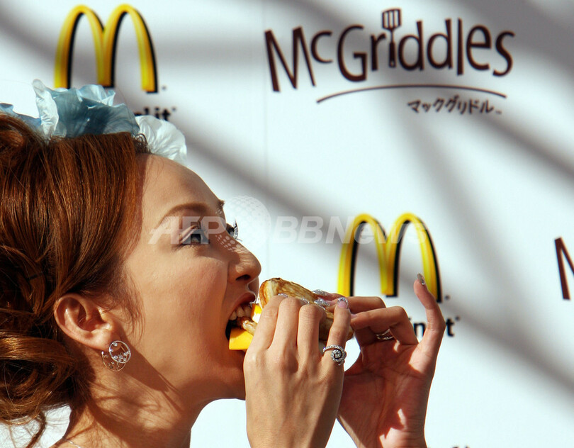 【東京 19日 AFP】日本マクドナルドは10日、15日から販売を開始する新しい朝食メニュー「マックグリドル」の記者発表会を行った。ゲストとして神田うの、磯山さやからが登場した。「マックグリドル(McGriddle)」は米国、カナダ、中国で大ヒットを記録したメニュー。写真は10日、都内で開かれた記者会見で「マックグリドル」を手にする磯山さやか(左)と神田うの(右)。(c)AFP/TOSHIFUMI KITAMURA