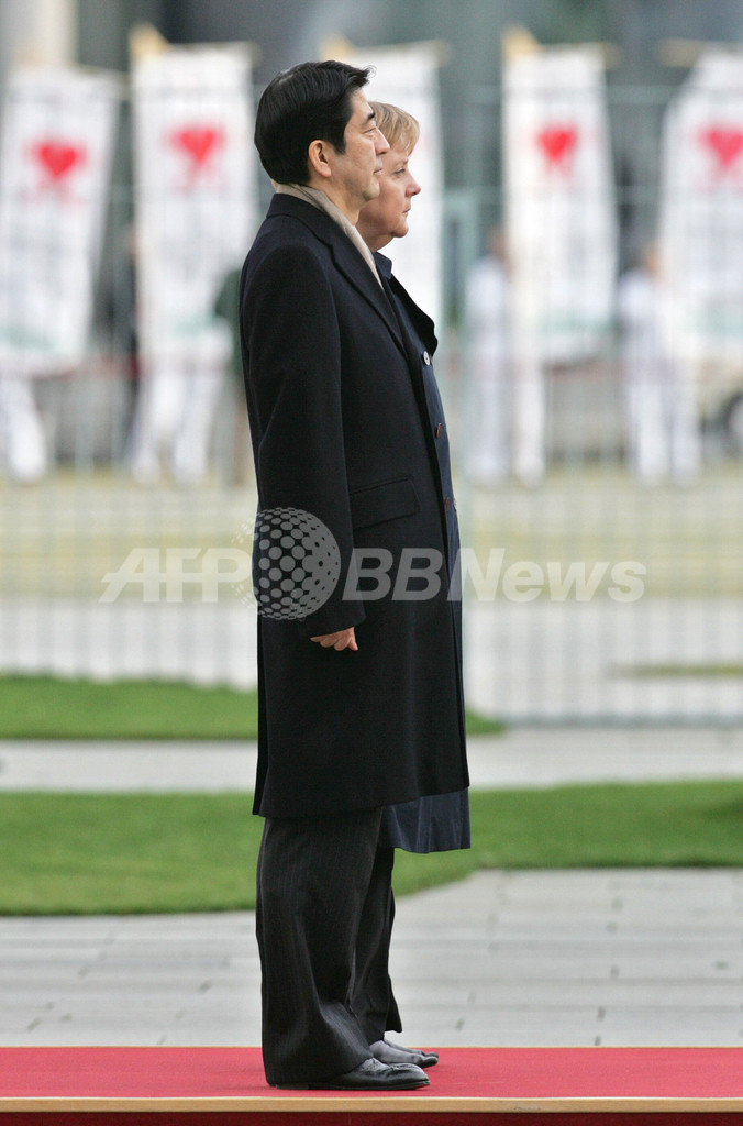 写真は同日、ベルリンに到着し公式歓迎式典に臨む安倍首相とメルケル首相。(c)AFP/DDP/MICHAEL KAPPELER