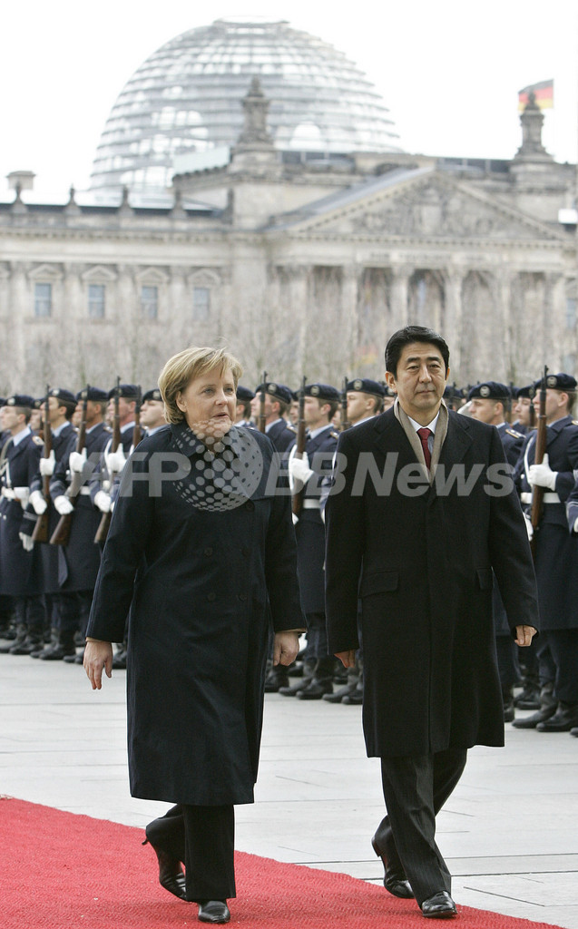 写真は同日、ベルリンに到着し公式歓迎式典に臨む安倍首相とメルケル首相。(c)AFP/DDP/MICHAEL KAPPELER
