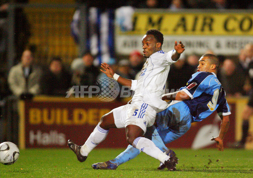 【ハイウィコム/英国 10日 AFP】サッカー、イングランド・カーリング杯(Carling Cup)・準決勝、ウィコム・ワンダラーズ(Wycombe Wanderers)vsチェルシー(Chelsea)、第1戦。試合は1-1のドロー終わり、4部に相当するリーグ2のウィコムはプレミアリーグ2連覇中のチェルシーと引き分けた。第2戦は23日にチェルシーの本拠地スタンフォード・ブリッジ(Stamford Bridge stadium)で行われる。写真は、チェルシーのアシュリー・コール(Ashley Cole、右)と競り合うウィコムのケビン・ベッツィー(Kevin Betsy)。(c)AFP/ADRIAN DENNIS