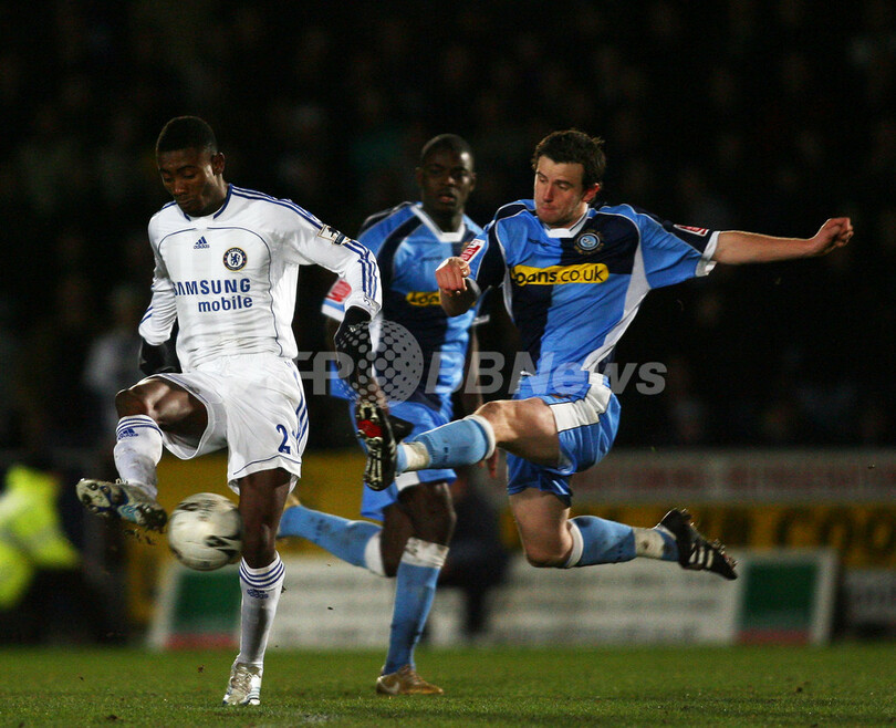 【ハイウィコム/英国 10日 AFP】サッカー、イングランド・カーリング杯(Carling Cup)・準決勝、ウィコム・ワンダラーズ(Wycombe Wanderers)vsチェルシー(Chelsea)、第1戦。試合は1-1のドロー終わり、4部に相当するリーグ2のウィコムはプレミアリーグ2連覇中のチェルシーと引き分けた。第2戦は23日にチェルシーの本拠地スタンフォード・ブリッジ(Stamford Bridge stadium)で行われる。写真は、チェルシーのアシュリー・コール(Ashley Cole、右)と競り合うウィコムのケビン・ベッツィー(Kevin Betsy)。(c)AFP/ADRIAN DENNIS