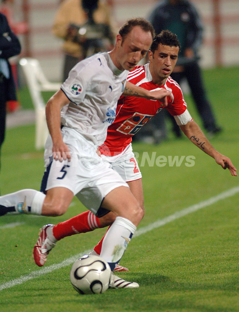 【ドバイ/UAE 10日 AFP】サッカー、モハメッド・ビン・ラーシド・アル・マクトゥーム国際サッカー選手権(Mohammad bin Rashid Al Maktoum International Football Championship)・決勝、ラツィオ(SS Lazio)vsベンフィカ(Benfica)。試合は0-0で迎えたPK戦の末ベンフィカが5-4で勝利を収め、優勝を果たした。写真は、トロフィーを掲げるベンフィカの主将シモン・サブロサ(Simao Sabrosa、左)。(c)AFP/KAMAL MOGHRABI